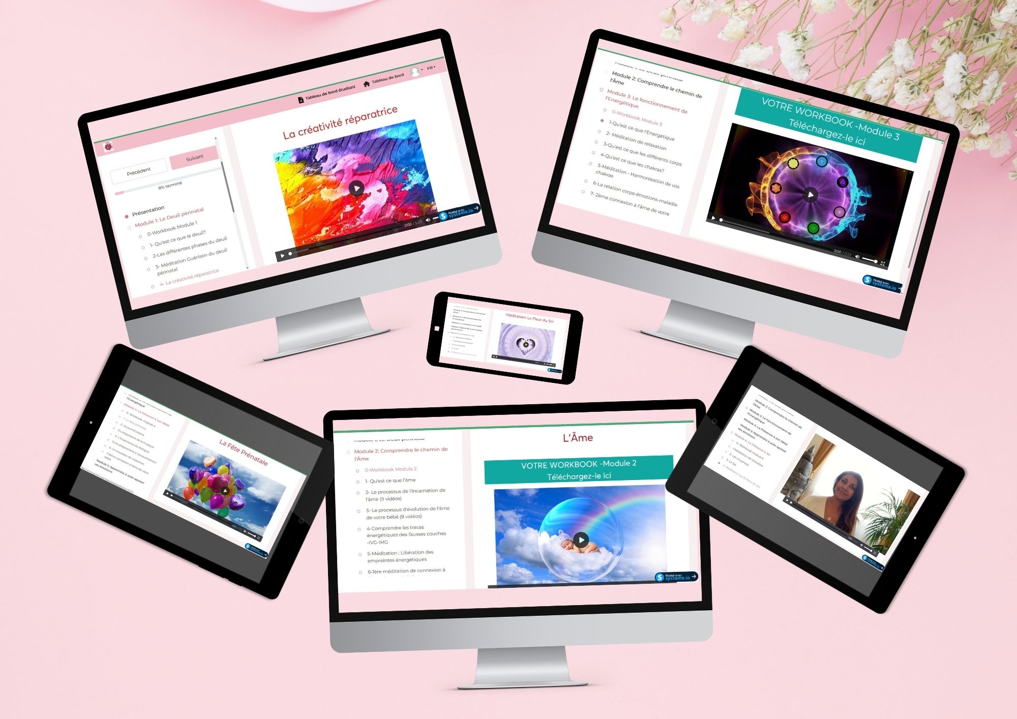 Chaque module est accompagné de méditations canalisées, de travaux vibratoires ciblés et de rendez-vous individuels pour ancrer ta transformation.